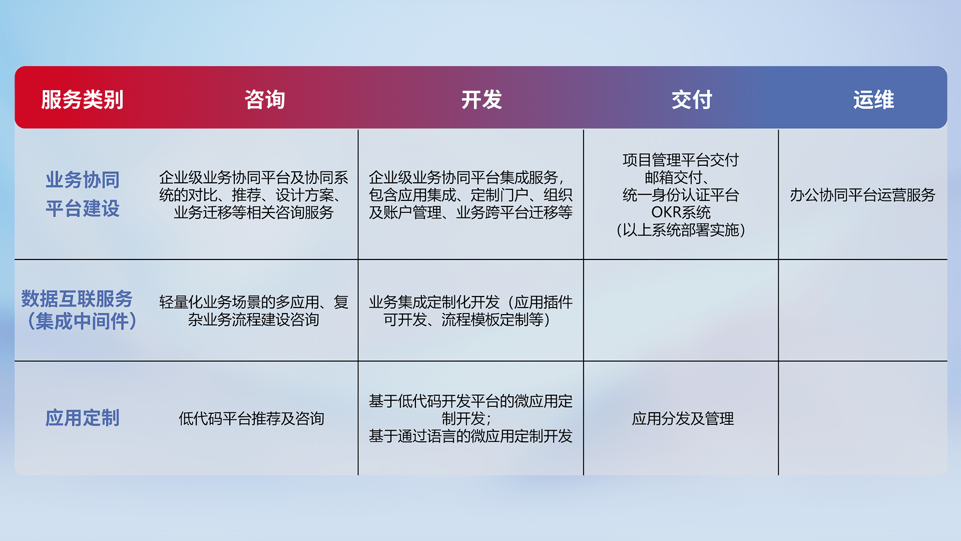 针对钉钉、、企微、、IDaas等平台级产品提供产品的规划、、、、方案、、、、交付、、、定制化开发等服务,,实现如统一协同办公、、智能客户服务、、混合会议管理、、、、智能数据查询、、、等业务场景,,,实现数字化转型。。。